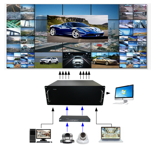 外置拼接解碼處理器(H.265)是專門為同時接入處理網絡攝像機(IPC)和外部源輸入信號(HDMI,DVI,VGA等)而設計,采用最新的專用圖像解碼芯片與FPGA搭配,通過專用圖像解碼芯片解碼網絡攝像機的信號,然后再和通過FPGA接入的外部源輸入信號混合處理,實現(xiàn)圖像切換,拼接,開窗,漫游等功能,是目前解決網絡攝像機